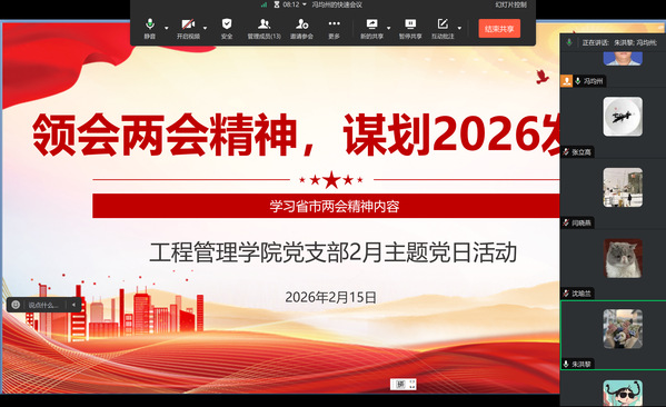 为深入学习贯彻省、市两会精神,进一步统一思想、凝聚共识,工程管理学院党支部于2月15日开展线上2月份主...