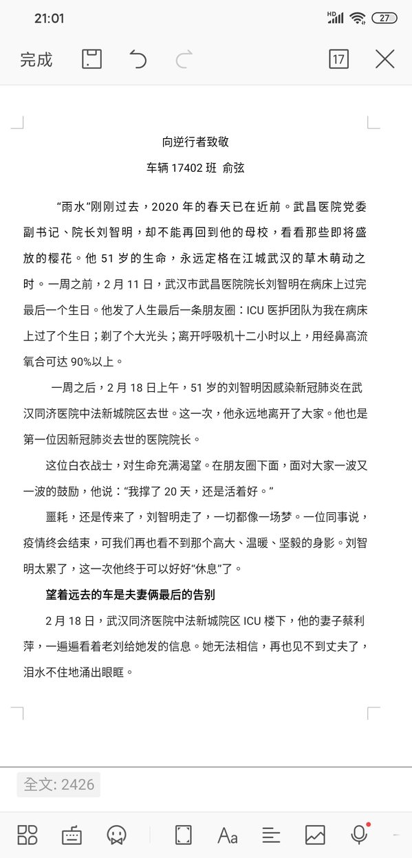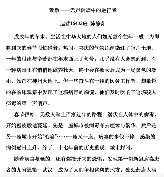 运营17401班黄思雨同学写道:在凛然严冬中,如钟南山一般的逆行者毅然选择奔赴最前线,在那个没有硝烟的战场,他们不惧险难以血肉之躯为你我撑起生命的屏障。他们或许并非身怀异禀,却有一颗炽热而执着的心。他们一个个远离他们的家人,远离他们的孩子,去为那些不认识的陌生人,去救助他们的生命,这就是白衣天使——医生。