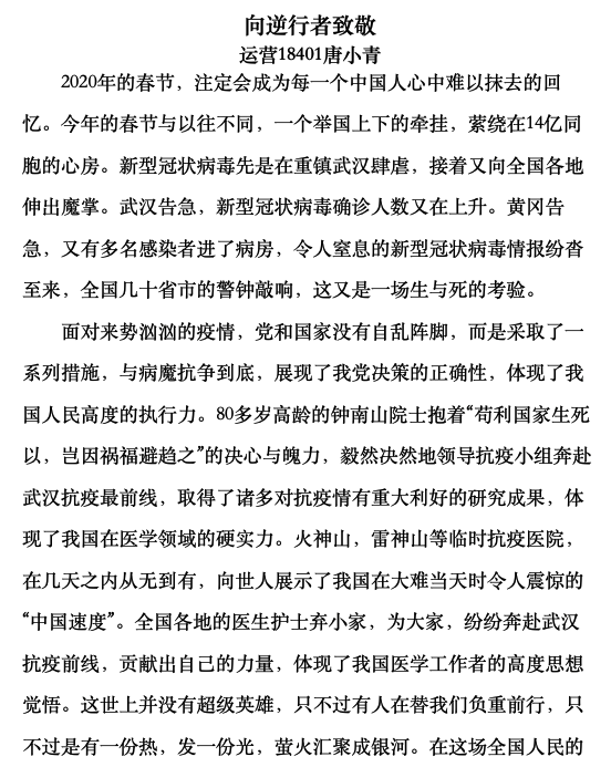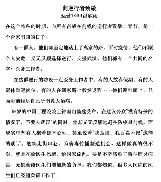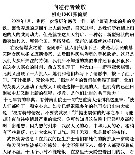 机电18401班张庭康同学写道,这些逆行者也是父母,是子女,是姐妹,是兄弟,是黄色皮肤的人,他们是寨子里的居民和过客,是跋山山川河流的人。他们是你遇见或未见的人类,是住在大地上的灵魂。他们和她们此刻的辛苦我们可以知道,却很难想象。向奋斗在一线的所有工作人员致敬!向钟南山李兰娟这样的英雄们致敬!向那些在这次战役中贡献出自己一份力的普通人致敬!向所有因病殉职的烈士们致敬!