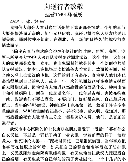 运营16401马雨辰同学说,正是医护人员的大无畏的牺牲精神拯救了病人的生命。一封封的请战书上坚定的话语,是所有的医护人员在踏入这个行业时的初心。不幸的是,还是有医护人员倒在了战役一线,但是我们会永远记得他们,记得在2020年的新岁奋战在抗疫一线的最美逆行者!