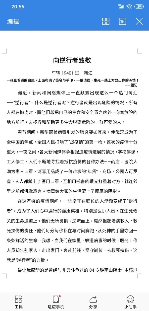 车辆19401班韩江同学写道:在这严峻的疫情期间,坚守在职位的人渐渐变成了“逆行者”,成为了人们心中遍行的孤胆英雄,特别是医护人员,在生死攸关的生命通道上,他们无所畏惧、逆流而上,毅然担起治病救人,救死扶伤的责任,他们每分每秒都在与时间赛跑,从死神的手里夺回一条条鲜活的生命。我想,当我们在家里,躲避病毒的时候,医务工作人员却告别家人,走出家门,奔赴前线,坚守岗位,去救死扶伤,这就是“逆行者”的力量。