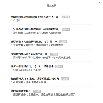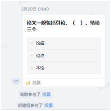 汽车营销教研室的黄蓓蕾老师,任教《毕业论文写作指导》课程,选用企业微信会议模式+学习资料结合的方式进行授课,力求做到线上课堂接近实际课堂。为保证课堂效果,黄老师结合本节课知识点,设计成选择题,采用企业微信群中投票功能,进行实时反馈,并将其运用到整个教学过程中,投票的结果可作为平时成绩的重要依据。