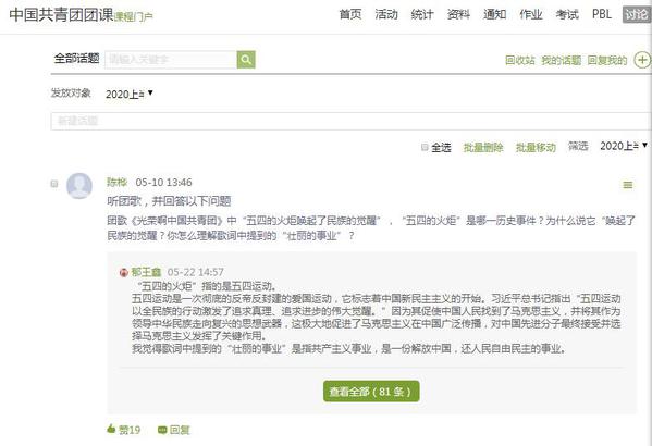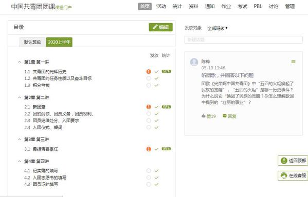 校团委通过超星学习通平台,腾讯课堂发布签到、讲授团课内容,学生通过观看团课视频,完成课后习题,参与讨论等多种方式进行线上团课学习。本次线上团课主要分为四个部分,共计11个小结,从共青团的光辉历史到团的奋斗目标再到团的章程,同时结合新冠疫情特殊背景,开设了“勇担青春责任”的团课。