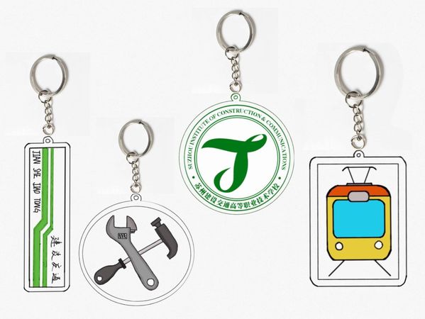 5.钥匙扣。设计者:运营18401时欣妮。首先,锤子和扳手代表的是轨道系的机电专业,他们晚上检查钢轨是会用锤子敲击钢轨来判断是否完好,扳手就是用来拧一些零件。地铁车头代表轨道系的车辆专业,因为他们毕业后可能会去驾驶车辆。站牌代表的就是轨道系的运营管理专业,他们主要针对服务,票务,站台一类所以用站牌表示。最后就是我们轨道交通工程系的系徽和代表学校的校徽。而且钥匙扣还有感情连在一起的含义,希望我们所有人都可以团结、友爱、互助。