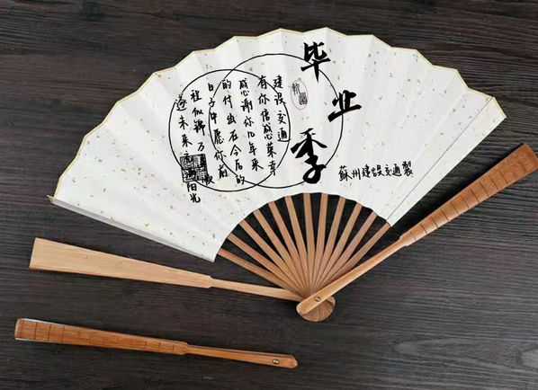 2.扇面。设计者:运营18401姜雅洁、运营18401申雨杉。主要目的是希望给即将毕业的学生做纪念,感谢他们这几年在学校做的一切,毕业对于他们来说可能是要和相处几年的老师和同学分别,但是祝愿即将踏入职场的他们“未来明媚,前程似锦”。设计的内容是以毕业季为主题,结合书法、我校校徽加之对毕业生的祝福语构成全图。