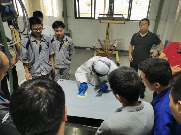 8月11日下午,首先进行选手赛前培训,由我校省技能大赛一等奖的获得者虞欣和张牧同学,分别做汽车涂装赛项和汽车钣金赛项的流程现场演示。让企业技师们充分了解标准化的工艺流程,也展示出我校双主体育人的高质量和成果,得到企业的一致好评。
