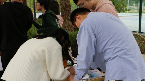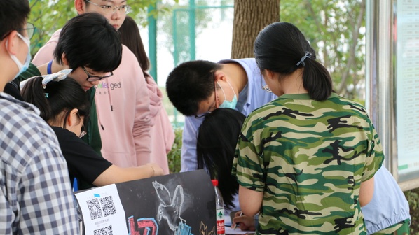 明玥文学社招新处正对面,就是2020级新生军训现场,中午11点20分,伴随着清脆的下课铃声响起,招新活动也是正式的拉开了帷幕。