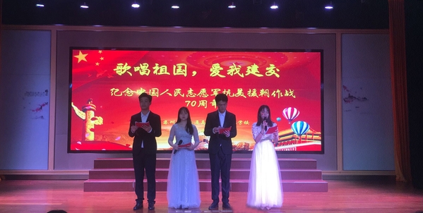 今年是纪念中国人民志愿军抗美援朝作战70周年。为学习和弘扬中国人民志愿军的伟大爱国主义精神和革命英雄主义精神,引导青年学生感受当年共产党人在维护世界和平战斗中与浴血奋战的牺牲,领悟肩上深深的历史责任和社会责任,同时为增强班级凝聚力,丰富校园文化生活,环境艺术工程系于10月22日13:30在报告厅隆重举行第九届“歌唱祖国,爱我建交”大合唱。本次合唱的主题是“纪念中国人民志愿军抗美援朝作战70周年”,环艺系陈鑫主任、陶敏芳副主任以及各班班主任、专业老师都观看了本次比赛并担任评委。
