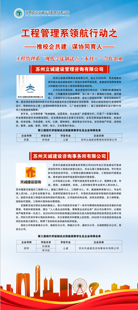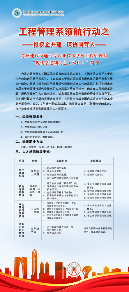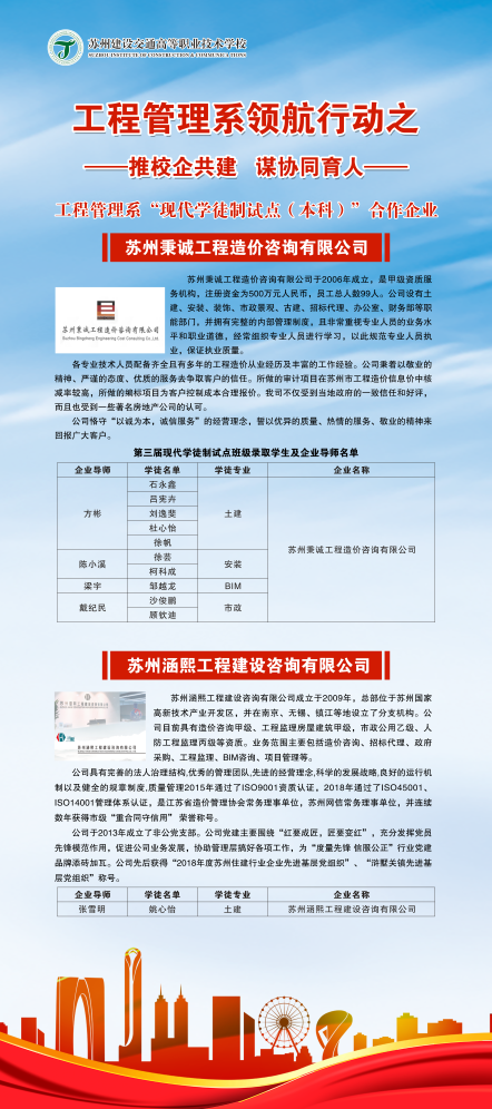 工程管理系学徒制试点工作经过三年的实践,企业参与数量明显增加,教学师资队伍逐渐完善,人才培养方案不断完善,人才输出质量有明显提升,是对工程管理系开展领航建设的有力推动。今后,工程管理系将继续“推校企共建,谋协同育人”探索校企双方 “双主体”的人才培养模式,充分拓宽学生实习和就业渠道,为学校领航建设添砖加瓦。(图/沈瑜兰 田兴 文/高秀梅)