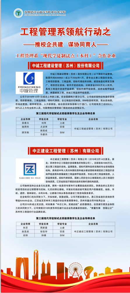 自2017年开始,工程管理系紧紧抓住校企合作的政策指引,在苏州市工程造价管理协会的支持和指导下,与苏州区域若干家造价咨询类企业在职业技能培养、人才输出、技术服务等方面建立深度校企合作,成立“现代学徒制实验班”试点。自试点以来,先后开班三期,取得较好成效。2020年在学校领航建设的有力推动下,第三期现代学徒制实验班开班典礼于2020年11月5日下午13:30,在建筑实训楼310室隆重举行。出席本次典礼的有我校副校长戎成,工程管理系主任冯均州,来自苏州市各知名造价公司的企业导师苏嘉、朱羿、赵呈虎、谷帅、薛春玉、施周华、顾芳燕、马燕忠、陈小溪、梁宇、戴纪民、庞友、王昆、吴武平、刘刚、张雪明、邵铧、陈云喆以及我系16级全体学徒。此次典礼由冯主任主持。