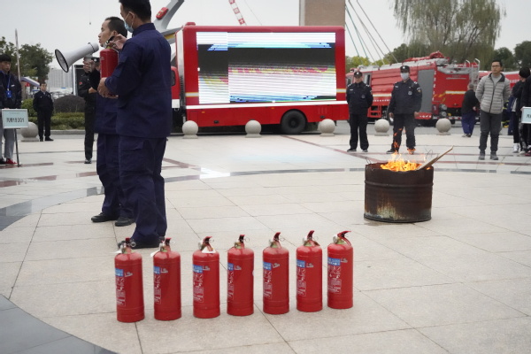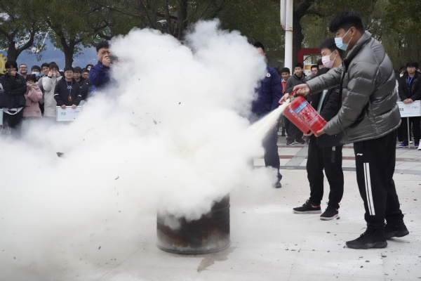随着警报声拉响,全体师生以最安全最迅速的方式到达指定安全区域。随后,消防人员详细讲解了灭火器的使用方法,并进行现场演示,几位学生上台体验如何使用灭火器。汽车工程系全体师生还观摩了消防人员使用消防车随车水枪的灭火方式。