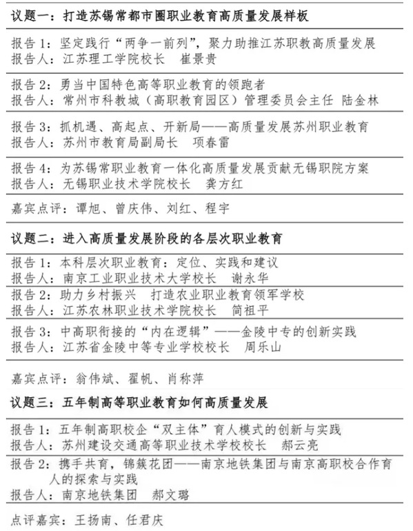 专家学者围绕“打造苏锡常都市圈职业教育高质量发展样板”“进入高质量发展阶段的各层次职业教育”“五年制高等职业教育如何高质量发展”等议题进行学术交流研讨。