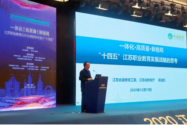 本次论坛聚焦“一体化·高质量·新格局:江苏职业教育以什么样的状态进入‘十四五’”这一主题,科学研判“十四五”江苏职业教育发展大势,共同把脉江苏职业教育发展样态,深入探讨江苏职业教育发展路径。教育部职业技术教育中心研究所所长王扬南,教育部职业教育与成人教育司综合改革处处长任占营,江苏省教育厅厅长、党组书记、省委教育工委书记葛道凯等领导出席论坛。