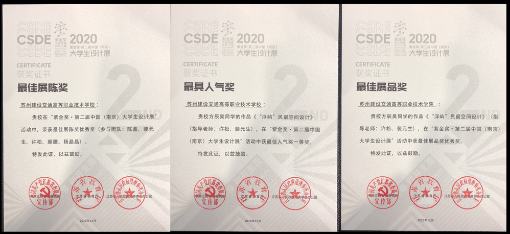321日,在百花盛开的春天,环艺系收到由江苏省省委宣传部、省教育厅、省人民政府港澳事务办公室联合签章的紫金奖.第二届中国(南京)大学生设计展三个奖项。