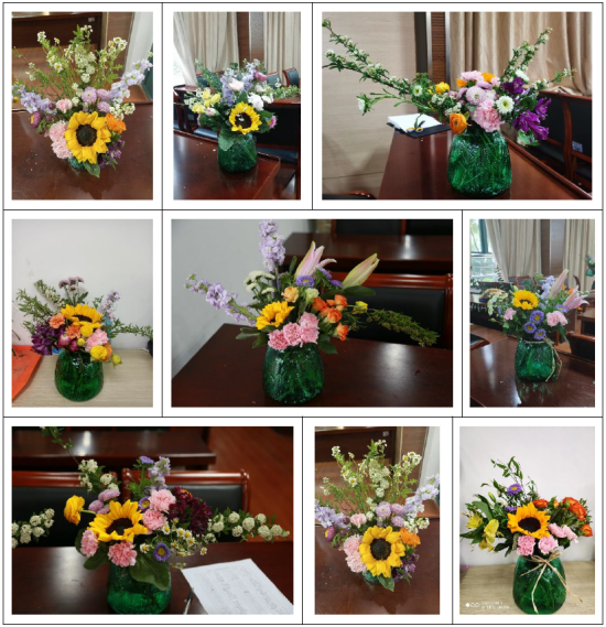 从踏入活动现场、看见桌面上有序放置的鲜花花材和工具起,女教职工们就表现得兴致盎然,如今早就按捺不住,跟着花艺老师边学习边开始动手体验。真不愧为巧手的园丁,处理起花材来真是有模有样,整理、预处理、比对、剪枝、插放、调整,整型,一步步做来,老师们完全沉浸在花艺之中,一件件花艺作品渐次在老师们的桌面上成型。举起手机,为作品拍一个特写,或者手捧作品摆一个美丽POSE,再互相夸夸对方的作品,现场气氛空前高涨。