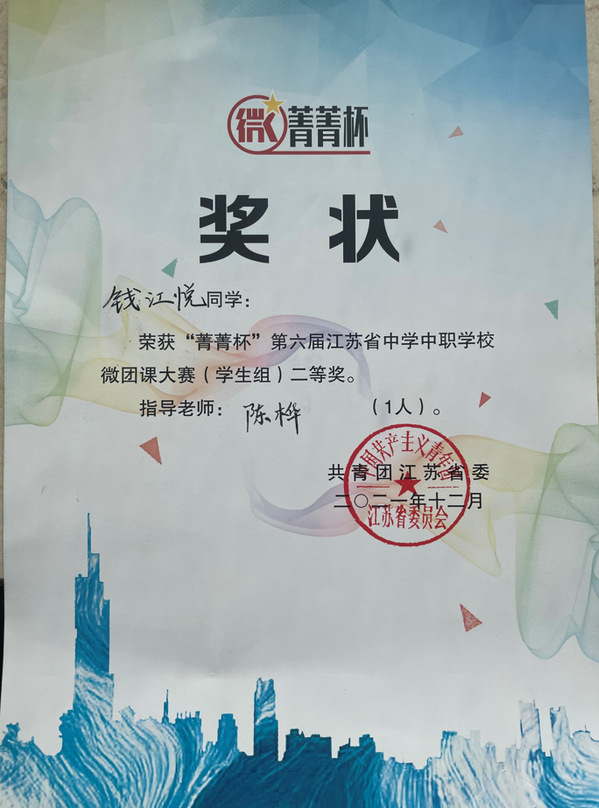 日前,我校学生钱江悦参加了扬中市第一中学承办的“菁菁杯”第六届江苏省中学中职学校微团课大赛,表现优异,最终荣获省赛二等奖。