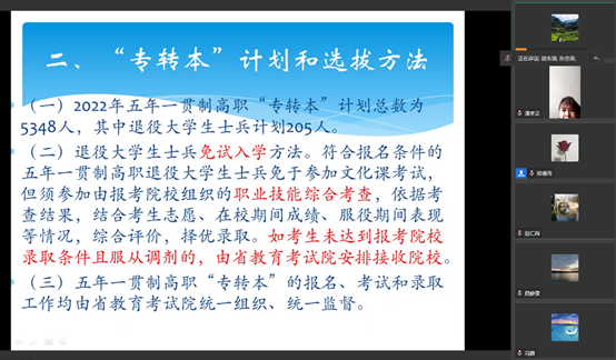 会上,胡永琪副处长就省教育厅关于做好2022年五年一贯制高职(高师)“专转本”工作的通知进行了解读,对报名条件、“专转本”计划、报考院校、时间节点等作详细介绍,部署我校2017级“专转本”报名推荐工作,明确了学生自愿报名、班主任推荐、系部初审、学校审核的工作流程。