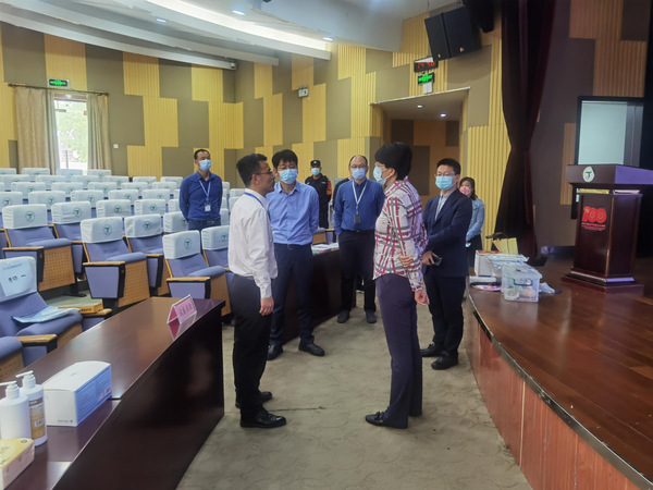 5月20日下午,教育局局长周志芳、副局长项春雷、高等教育与职业教育处处长沈文、苏州教育考试院院长李东升一行来我校视察本次考务工作的准备情况。我校党委书记、校长郝云亮,谢永东副校长,教务处张建雄处长,后勤处陶启栋处长,保卫处张帅处长陪同检查。郝校长就本次考试基本情况、考务工作准备、疫情防控布置等三个方面进行详细汇报,检查组一行实地察看了考务办公室、试卷保密室、考场及学生休息室的布置情况。最后,周局长充分肯定了学校各方面的准备工作,同时指出,考务组织工作要以服务学生为重点,用心做好疫情防控和考试各项准备工作,既要防疫情,又要防舞弊,确保疫情防控和考务工作平稳有序推进。