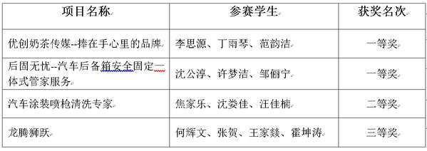 本届大赛经初赛(网评)、决赛2个阶段。经过初赛(网评)直接淘汰40%项目,30%的项目获三等奖,30%进入决赛,我校“龙腾狮跃”获创业组三等奖,“优创奶茶传媒-捧在手心里的品牌”、“后固无忧-汽车后备箱安全固定一体式管家服务”和“汽车涂装喷枪清洗专家”3个项目入围实践启蒙组决赛。在决赛中,选手们沉着冷静、自信面对、敢于挑战,获2个一等奖、1个二等奖。我校已连续3年获得江苏省职业学校创新创业大赛一等奖。