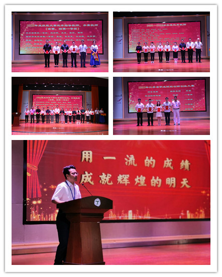 大会第一部分,首先对2021-2022年度优秀教师、优秀班主任、优秀教育管理工作者、技能大赛和教学能力大赛省赛国赛一等奖教师、创新创业大赛优秀指导教师、省班主任能力大赛获奖教师以及疫情防控优秀教工志愿者进行了表彰。