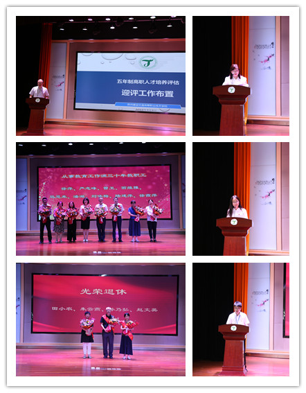 大会第二部分,为田小农、朱云燕、赵文英、孙乃弘等四位教职工举行了荣退仪式,感谢他们为学校的发展,为学生的成才,奉献了青春年华,真诚地希望退休老教师在合理、科学安排好自己退休生活的同时,继续为学校的发展发挥余热。大会同时表彰了从事教育工作满三十年的潘澔、徐萍等九位教职工。学校即将迎来江苏省五年制高职办学单位人才培养工作水平评估现场考察,谢永东副校长在会上作了迎评动员。
