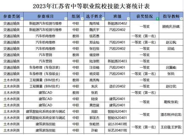 2月16日至20日,建筑CAD、工程测量赛项,分别在扬州高等职业技术学校、江苏省海门中等专业学校举行。建筑工程系师生组成的5支参赛队,奋力拼搏,勇夺2金3银,获奖的8名学生均进入国赛集训队。其中,张莉老师获得建筑CAD赛项教师组一等奖第一名。2月20日至23日,建筑智能化系统安装与调试赛项在我校国际教育园校区举行,经过3天的激烈比试,获1金1银。