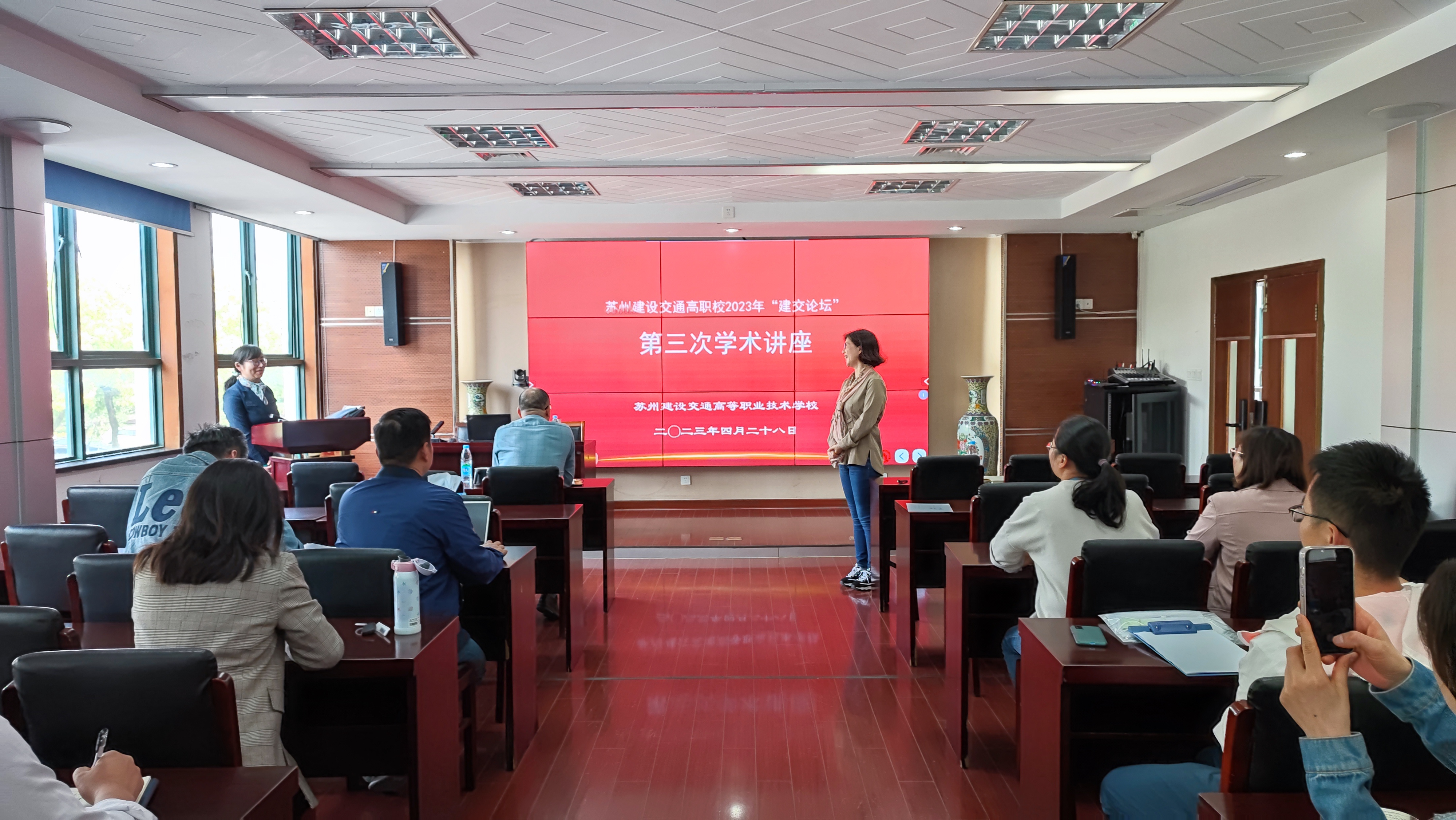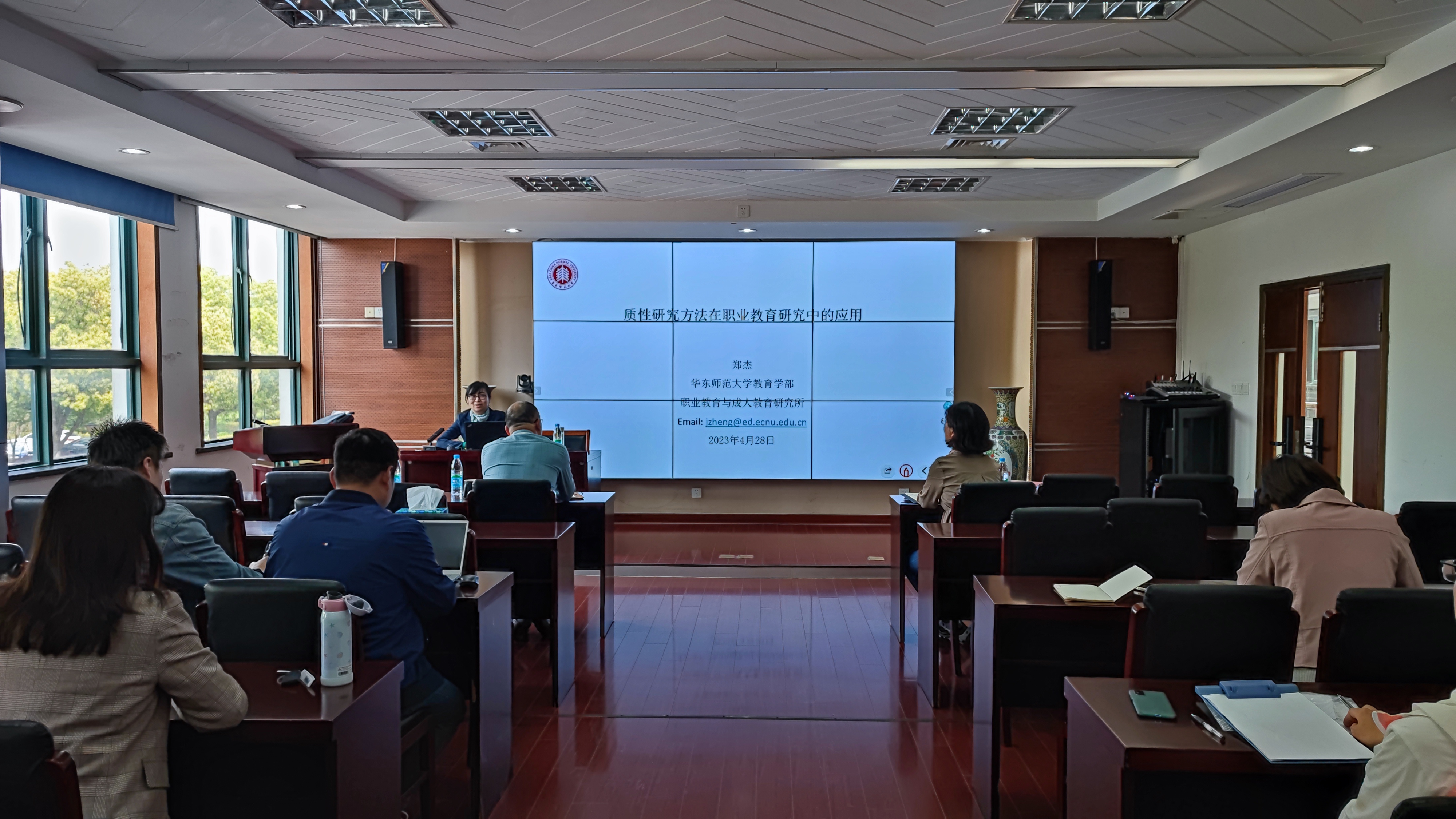 2023年4月28日,科研处在国际教育园行政楼215会议室举办了《质性研究方法在职业教育研究中的应用》讲座。本次讲座由科研处处长杨芳主持。华东师范大学职成教所副所长郑杰博士担任主讲人。副校长谢永东、商贸系主任罗明以及各系部近40名教师参与了本次讲座。