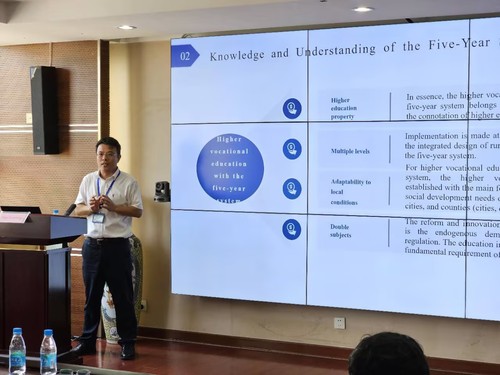 在学校行政楼215会议室,郝云亮校长向来自柬埔寨、老挝、尼泊尔、印度尼西亚、吉布提、莱索托、毛里求斯、南非、南苏丹、尼日利亚、巴拿马、古巴和苏里南等13个国家的37名职业教育官员介绍了学校办学和改革发展情况,详细介绍了学校立足五年制高职教育“高等性、多层次、在地性、双主体”的办学特征和优势,紧跟区域经济发展,贯彻一体化理念,实施人才培养实践的具体举措、实践经验和取得成效。期间,研修班成员就五年制高职人才培养过程、双主体办学模式、国际交流合作情况、五年制高职学生升学和就业情况等具体问题进行了针对性的提问,郝云亮校长从国家、地方政策,学校办学实际情况进行了详细解答。