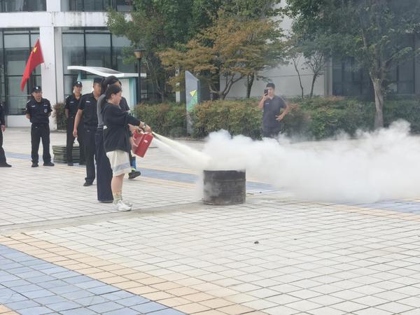 疏散演练结束后,保卫处赵仁辉副处长现场详细讲解灭火器的正确使用方法。“一看、二摇、三拔、四压”,安保人员示范了灭火器的操作步骤,随后组织师生代表进行实操练习。通过亲手操作,师生们切实掌握了灭火器的使用技巧,提升了初期火灾的处置能力。