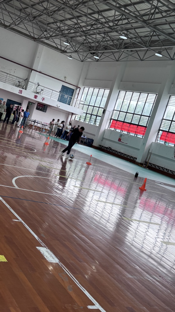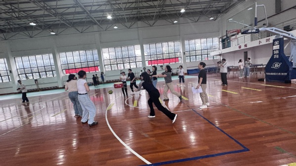 本次运动会设置了足球运球绕杆、一分钟跳绳、飞镖、行进间颠乒乓球四项个人项目,以及同心鼓、不倒森林、珠行万里三项集体项目。赛事按年龄分为甲、乙、丙三个组别,规则设计既富有趣味性又不乏挑战性,确保了不同年龄段的教职工都能找到适合自己的舞台。个人项目赛场上,可谓八仙过海,各显神通。足球绕杆区域,老师们脚下生风,灵活地带球穿梭,展现了精湛的球感。一分钟跳绳赛场,绳影飞舞,节奏急促,计数声伴随着阵阵喝彩。飞镖靶前,选手们凝神静气,瞄准、投掷,动作一气呵成,每一次高分都引来赞叹。颠球前行的老师们则小心翼翼,稳中求进,乒乓球在球拍上欢快跳跃,构成了一道独特的风景线。最激动人心的当属集体项目。“同心鼓”现场,队员们同心协力,眼随球动,依靠默契的配合创造了一次次精彩的颠球记录。“不倒森林”中,十人围圈,移步换杆,是对反应速度与团队信任的极致考验。“珠行万里” 则上演了速度与激情,队员们用PVC管搭建临时轨道,确保小球顺畅滚向终点,紧张的接力场面扣人心弦。