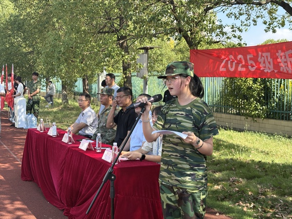 副校长戎成代表学校发表讲话,他详细阐述了军训的三大核心安排:两校区1200余名新生同步参训,其中尹山校区涉及6个班级,军训为期7天,第7天下午将开展两校区军运会操演出,检验训练成果。同时,他回顾了学校军训时间的调整历程——2018年起从9月调整至10月,正是为了给新生创造更凉爽的参训环境。