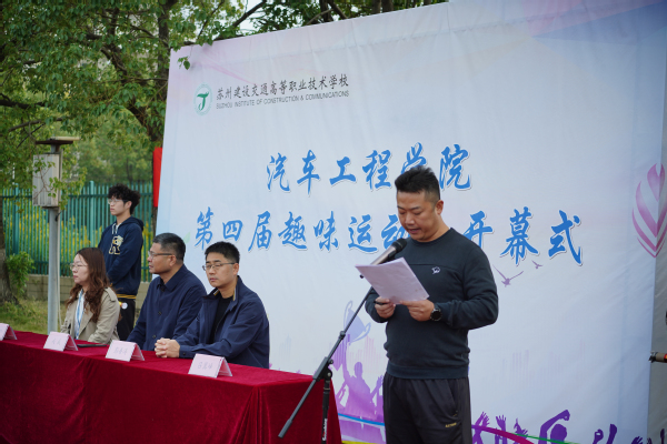 开幕式环节秩序井然,亮点十足。首先由裁判员代表邱斌率先登台宣誓,承诺将严格遵循公平、公正、公开原则,精准执裁、恪尽职守,为赛事的顺利推进保驾护航;运动员代表丁靖林上台,以铿锵激昂的誓言宣告,汽车学子将以尊重规则为前提,以勇于拼搏为信念,在赛场上展现良好竞技风貌。其次由学院学生处负责人吕翼峰详细解读赛事规则,明确比赛流程与注意事项。最后副校长戎成走上台前,高声宣布“汽车工程学院第四届趣味运动会现在开幕”,话音落下,现场瞬间掌声雷动,热烈氛围瞬间点燃全场。