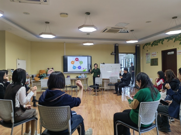 活动伊始,高畅老师以热身游戏“小蜜蜂”调动了现场气氛。随后,十二人分为四组,围绕高老师给出的“情绪暴躁的爸爸回家看到全职妈妈辅导孩子作业”这一家庭场景展开角色扮演。“爸爸”的急躁、“妈妈”的焦虑、孩子的委屈被老师们生动演绎。在小组分享环节,每组一名代表结合角色扮演经历阐述感受,“情绪稳定”、“夫妻关系影响亲子关系”、“踢猫效应”成为讨论焦点。大家普遍认同若家庭中某一方的负面情绪未及时疏导,很容易影响整个家庭的和谐相处。