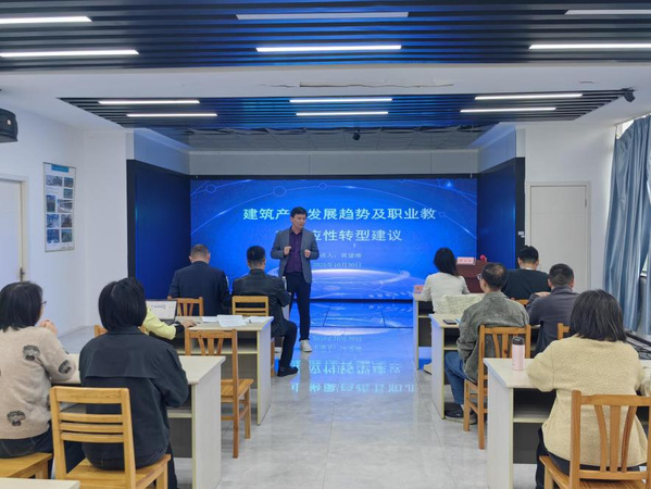 15:00活动正式启动,冯均州院长在开场致辞中指出,当前建筑产业正面临数字化、绿色化转型,亟需适配人才,职业教育需与产业深度联动才能破解人才供需难题。15:10至16:00,黄建维副总裁围绕“建筑产业发展趋势及职业教育适应性转型”开展讲座,既剖析了智能建造、低碳建筑等产业新方向,也提出增设新兴专业、融入前沿技术课程等职教转型建议。