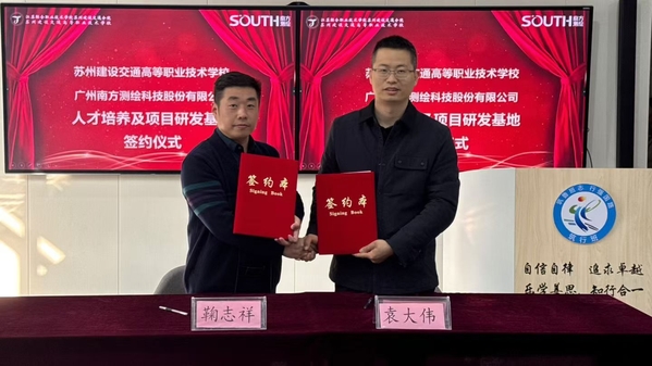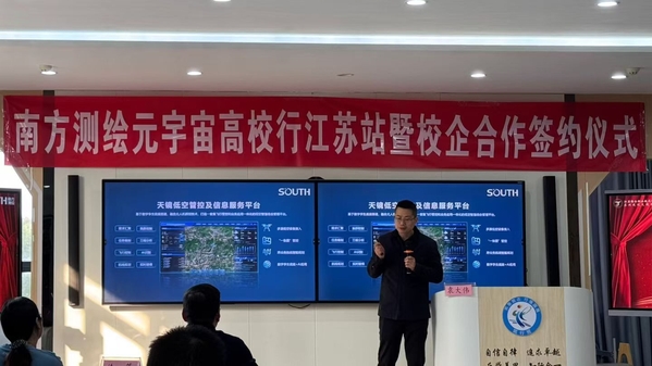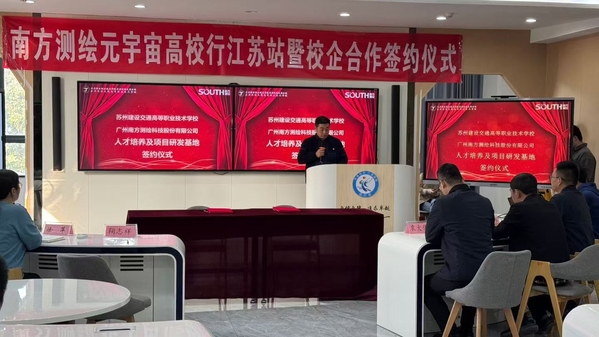 紧接着,南方测绘集团沪宁分公司总经理袁大伟先生登台致辞。他自豪地介绍,南方测绘作为测绘地理信息行业的领军企业,始终秉持着对职业教育的高度责任感,长期致力于职业院校的人才培养与技能竞赛支持工作。展望未来,他满怀期待地表示,希望与我校在教材建设、实训基地建设等多个领域展开更加紧密的合作,携手并进,为社会输送更多优秀人才。随后,双方举行了签约仪式,标志着合作迈入了新的阶段。