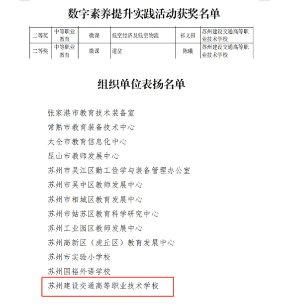 近日,苏州市教育局公布2025年苏州市教育数字化应用能力大赛(教师竞赛项目)获奖名单,我校祁文田、陈曦两位教师的微课作品荣获二等奖,学校同时入选“组织单位表扬名单”。这一喜讯充分彰显了我校在教育数字化转型工作中的显著成效与育人实力。