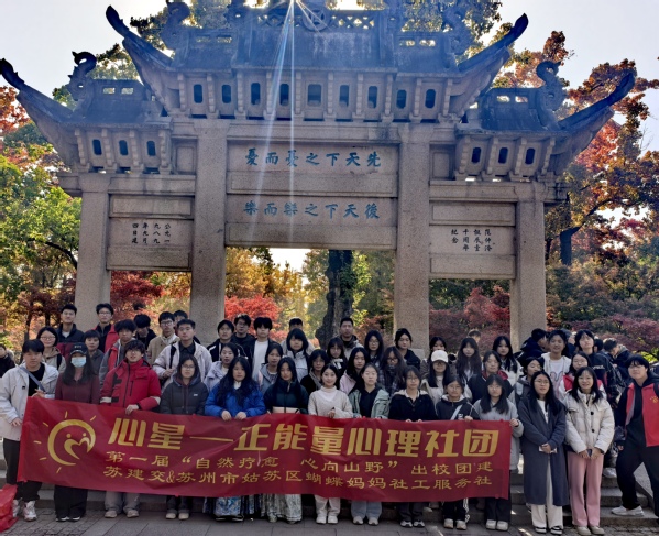 为进一步推进心理健康教育工作,帮助学生缓解学业压力、拓宽人际交往渠道,11月28日,我校首届“自然疗愈・心向山野”心理校外团建活动在天平山风景区成功举办。本次活动由学生工作处统筹协调,蝴蝶妈妈社工站吕老师与心星正能量社团联合精心策划,专职心理教师邹文华全程提供专业指导,全校47名师生共同参与这场自然与心灵的双向奔赴。