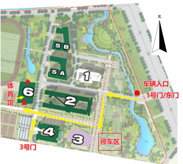 6号楼:体育馆(双选会会场) ● 学校东门(1号门) ▲ 会场主出入口/企业签到处 ◆ 会场次出入口 | 1号楼:行政楼 2号、4号楼:教学楼 3号楼:学术报告厅 5A、5B楼:实训楼 |
