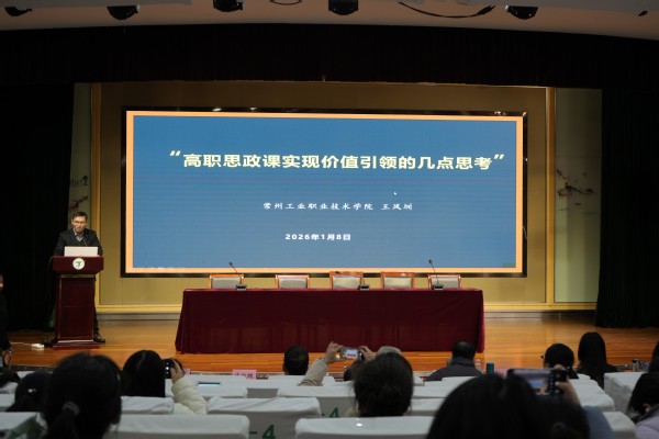 首先,我校党委副书记、校长万烨锋致欢迎辞。他代表学校党委对参加本次活动的领导、专家及老师表示热烈欢迎。他首先简要介绍了苏州建设交通分院的办学情况,并表示学校始终以“服务新经济、新产业、新技术”为目标,努力成为苏锡常都市圈职业教育改革的实验学校,助力每位学生实现人生出彩,其次,重点就学校在推动职教思政课守正创新方面分享了具体做法。学院思指委主任单位、南京财经分院副校长薛飞回顾了2025年思指委获取的成效,强调思指委作为筑牢思政育人“总枢纽”,将继续强化统筹协调、指导监督职能,为各位老师搭建更广阔的成长平台、提供更有力的支持保障,并对参会教师提出充分交流、聚焦问题研讨、注重成果转化三点期望。常州工业职业技术学院马克思主义学院教师王风圳副教授,围绕“高职思政课实现价值引领的几点思考”作讲座分享。王老师从三个方面展开论述,一是从技能大赛解读中看价值引领的必要性,二是从教学设计范式中看如何精准“备学生”,三是从自身参赛作品中看如何有效避免误区。他提到的“眼中有学生”“用思政语言将案例讲出彩”等观点,引发现场教师的强烈共鸣。整场讲座内容丰富、深入浅出,理论阐发与案例剖析贯通融合,既有学理深度,又有实践温度。