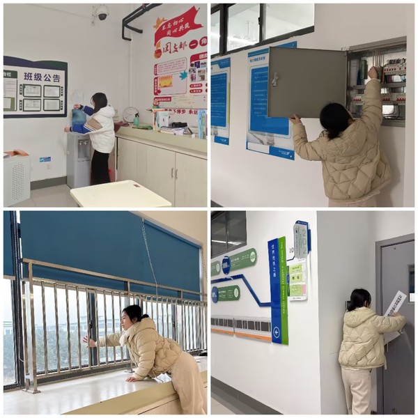 在教室与学生宿舍区域,班主任逐一深入、细致检查。各班教室,班主任重点检查门窗锁具是否关好锁牢,电灯、空调、饮水机、一体机等电器的电源是否彻底切断,确保教室内无用电、漏水安全隐患。学生宿舍,班主任重点检查水、电、门窗安全,全面排查私拉乱接电线、大功率电器等隐患,同时提醒同学们离校时将贵重物品带回保管,关闭所有电源开关,锁好门窗。对检查中发现的个别宿舍门窗闭合不严、插座未完全断电等问题,班主任现场督促整改,确保隐患即时清零。