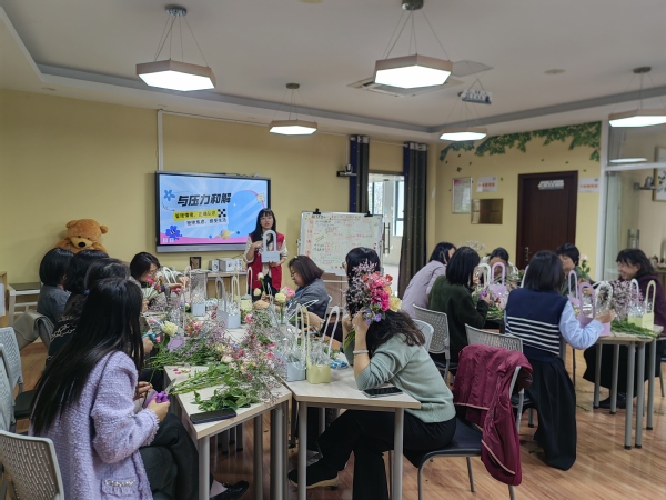 在花艺创作环节中,社工细致讲解花材养护、插花技巧与配色原则,老师们在专业指导下动手创作,自由发挥巧思,将缤纷花材打造成各具特色的花艺作品。花艺创作结束后,老师们不仅展示了各自的作品,还热情地分享了自己的创作心得,并互相欣赏彼此的手工艺品,在花香与交流中释放压力。