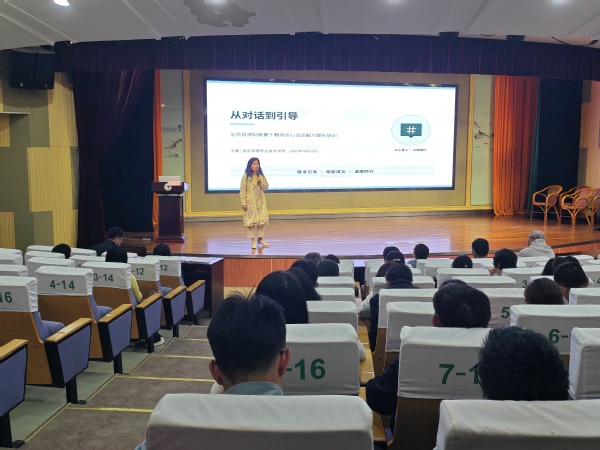 2026年4月10日下午,我校在教育园校区报告厅成功举办题为《从对话到引导:全员导师制背景下教师谈心谈话能力提升培训》的心理健康专题讲座。本次讲座由江苏联合职业技术学院润心工作组专家、南京高等职业技术学校王春副教授主讲,全体教师参会。学生工作处处长彭善涛主持活动,校党委副书记、校长万烨锋,党委委员、副校长戎成,党委副书记、纪委书记汪丽丽出席活动。