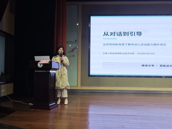 2026年4月10日下午,我校在教育园校区报告厅成功举办题为《从对话到引导:全员导师制背景下教师谈心谈话能力提升培训》的心理健康专题讲座。本次讲座由江苏联合职业技术学院润心工作组专家、南京高等职业技术学校王春副教授主讲,全体教师参会。学生工作处处长彭善涛主持活动,校党委副书记、校长万烨锋,党委委员、副校长戎成,党委副书记、纪委书记汪丽丽出席活动。