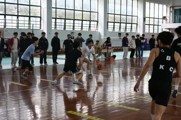 下午一点,欢送活动第一部分在体育馆拉开帷幕。由2026届毕业生组成的队伍与在校生代表队进行了一场精彩激烈的5对5篮球友谊赛。赛场上,双方队员全力以赴,默契配合,展现了良好的体育精神与团队协作能力。经过四十分钟的激烈对抗,最终2026届毕业生队以73:63的比分战胜在校生队,用一场胜利为自己的毕业离校征程划上了圆满的句号。