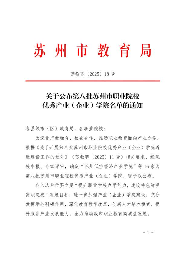 近日,根据《关于公布第八批苏州市职业院校优秀产业(企业)学院名单的通知》(苏教职〔2025〕18 号)文件...